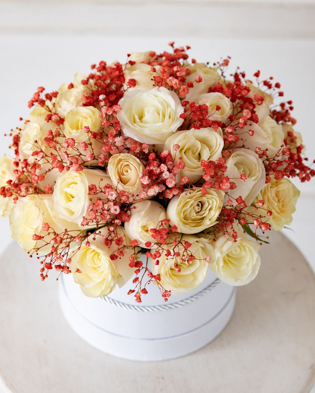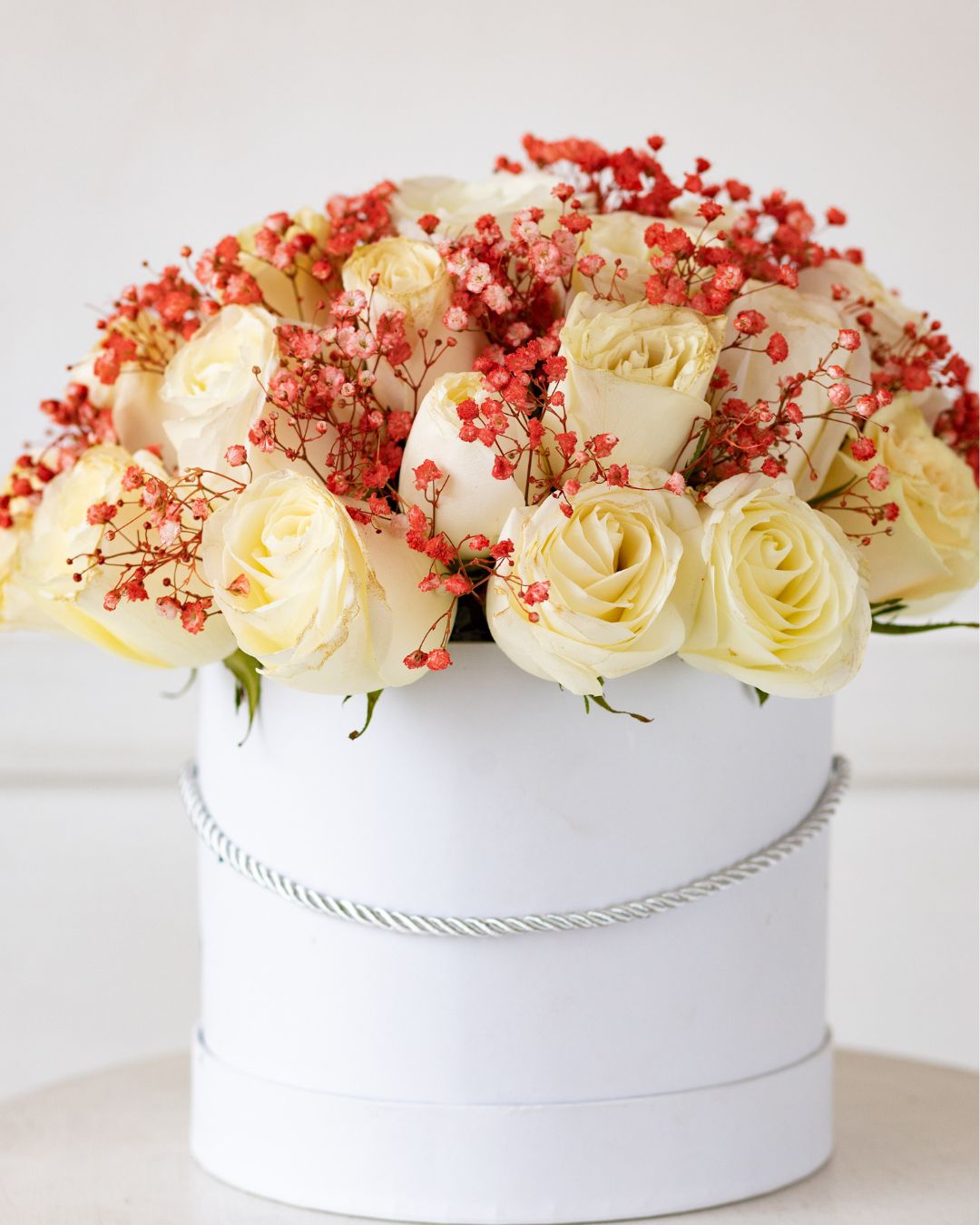 DescriptionA touch of red hatbox features white roses with a touch of red baby breath in a white hatbox Specifications Weight: 200gr Usage: Indoor & outdoor