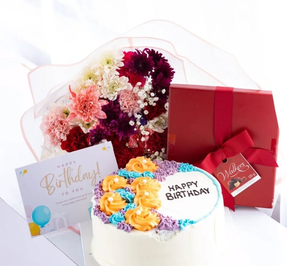Our best selling birthday package featuring 1kg black forest cake , Premium chocolates and a bouquet of flowers with a printed birthday card.