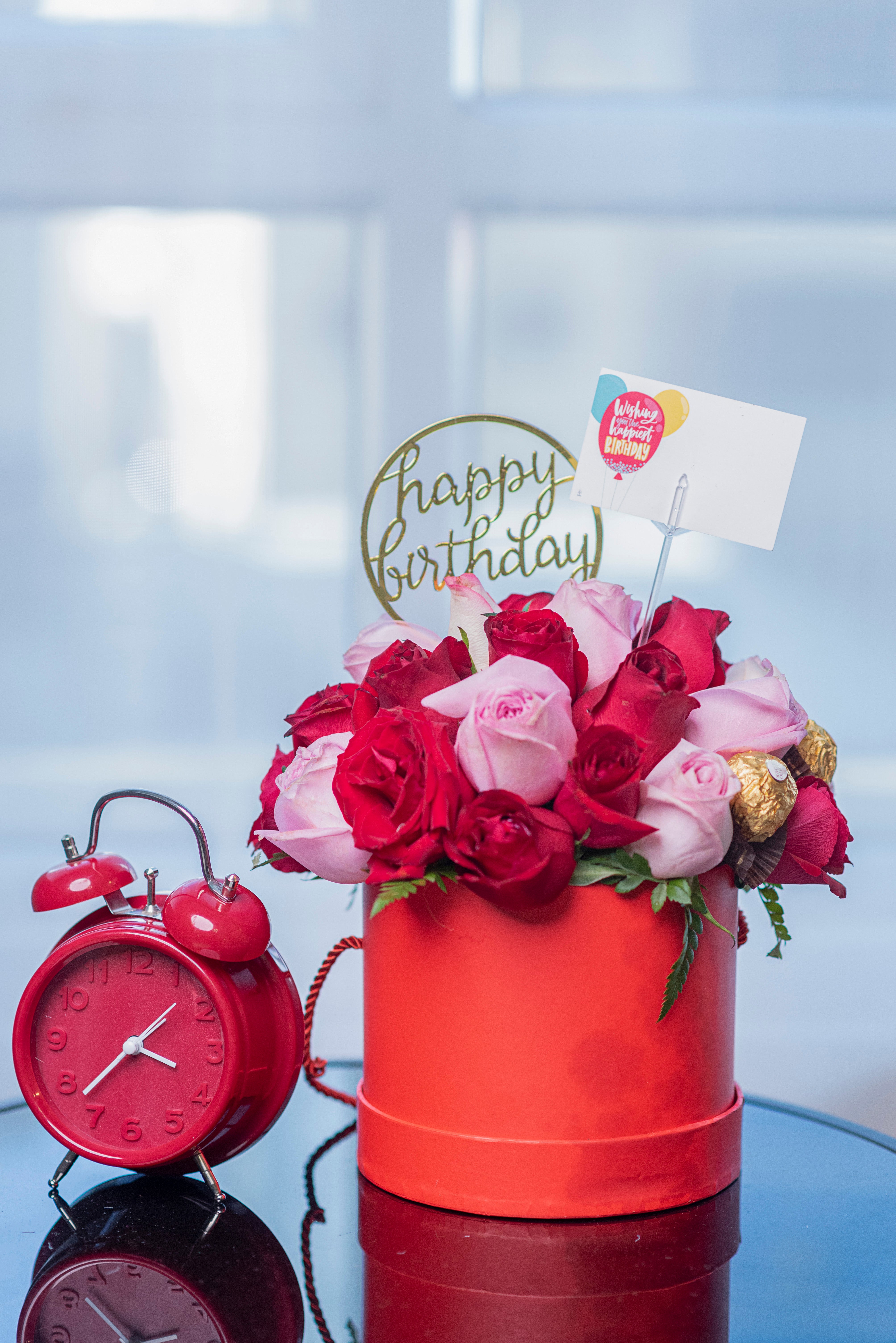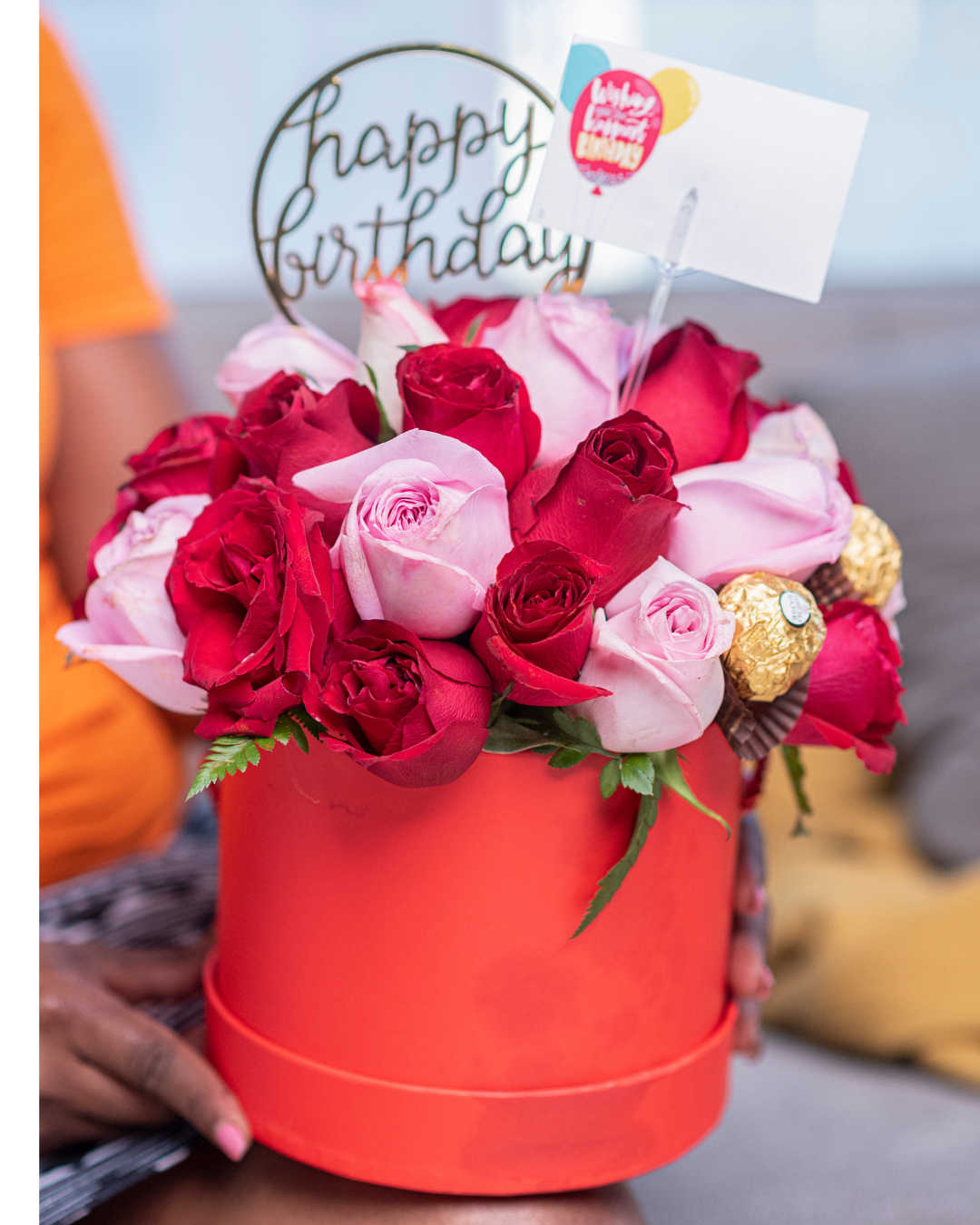Description It's someone's birthday and we want to make them feel special with our birthday hatbox that helps in bringing the moment to life . The hatbox features roses and ferrero rocher chocolates and a gold birthday topper to finish it off. Specifications Weight: 200gr Usage: Indoor & outdoor