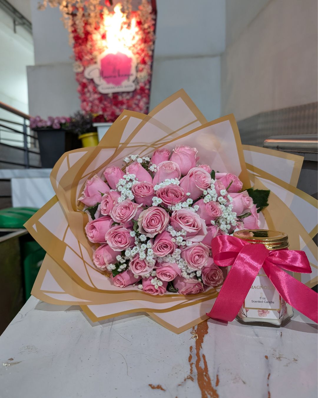 The bouquet is paired with a magnolia scented candle