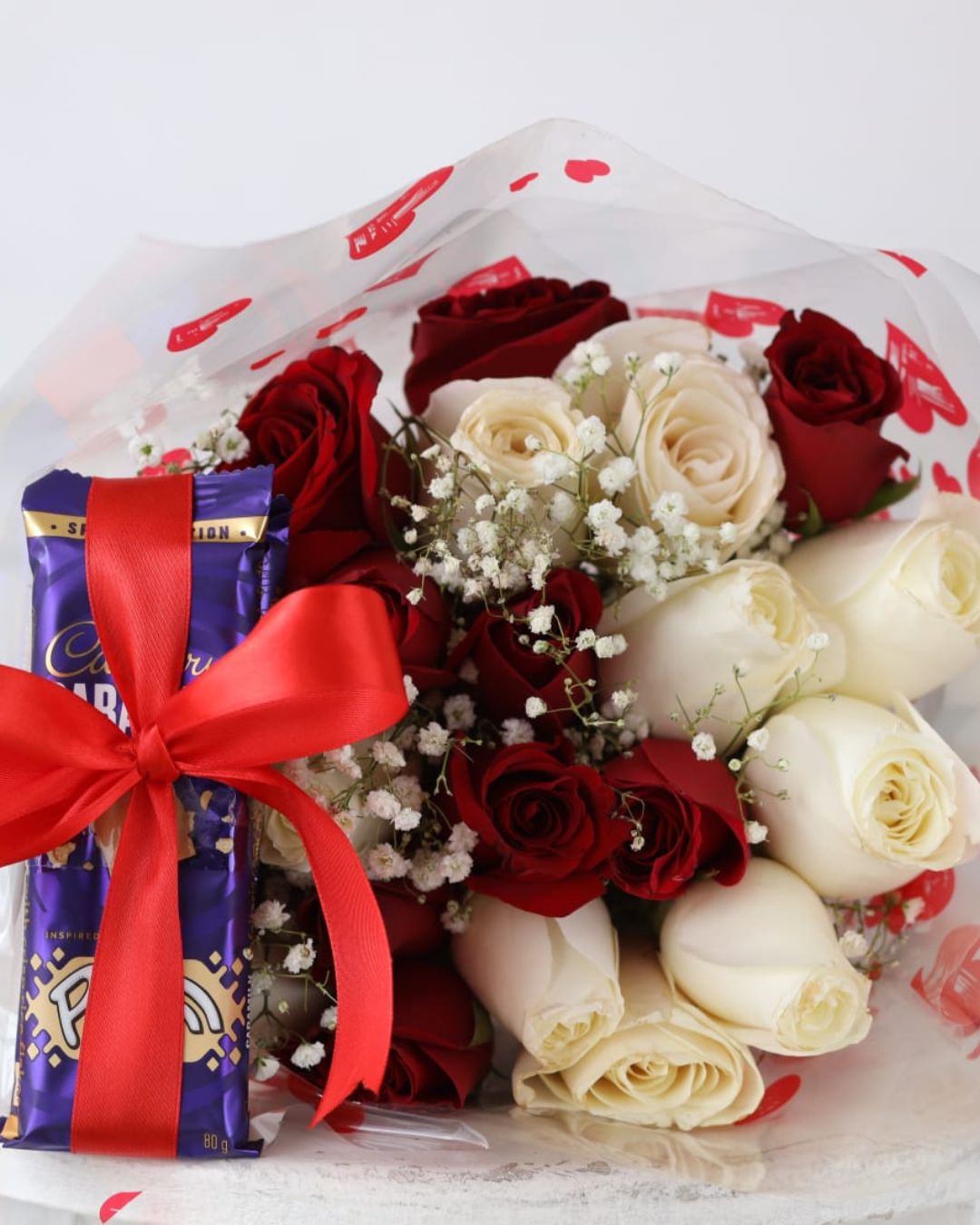 Our beautiful and best selling classic bouquet is a classic in its own right . The bouquet features red and white roses with baby breath and paired with a pair of dairy milk chocolate bars (2) . This affordable package also comes with a card to share your heart's message .
