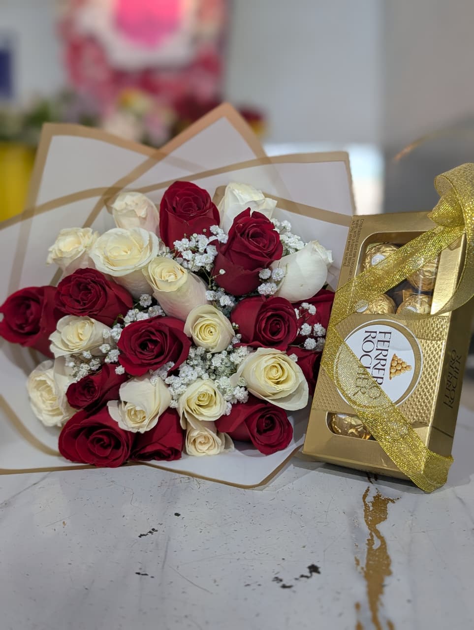 Our best selling and most favorite classic bouquet is a classic with white and red roses and this bouquet is paired with ferrero rocher chocolates to make it a beautiful affordable package.