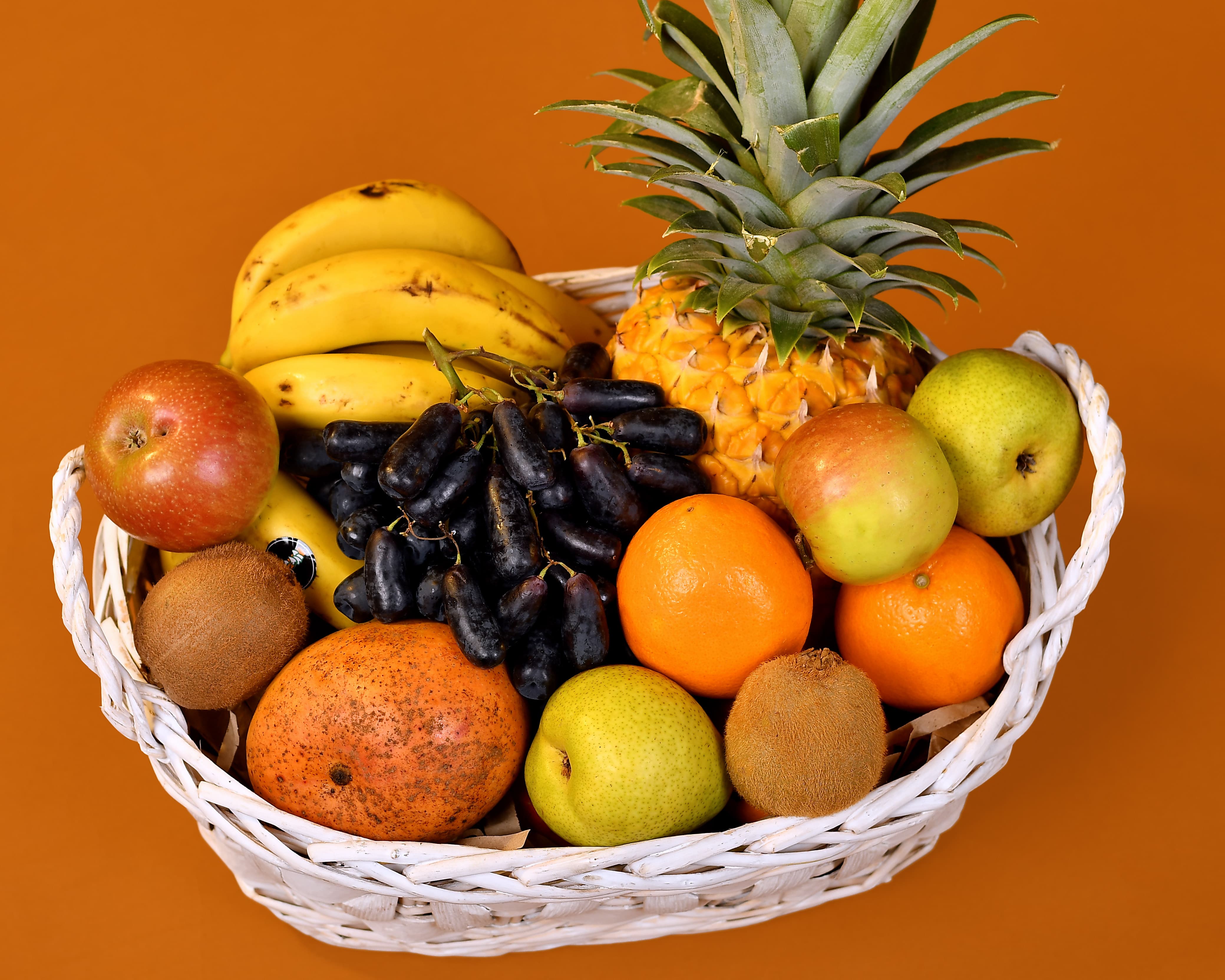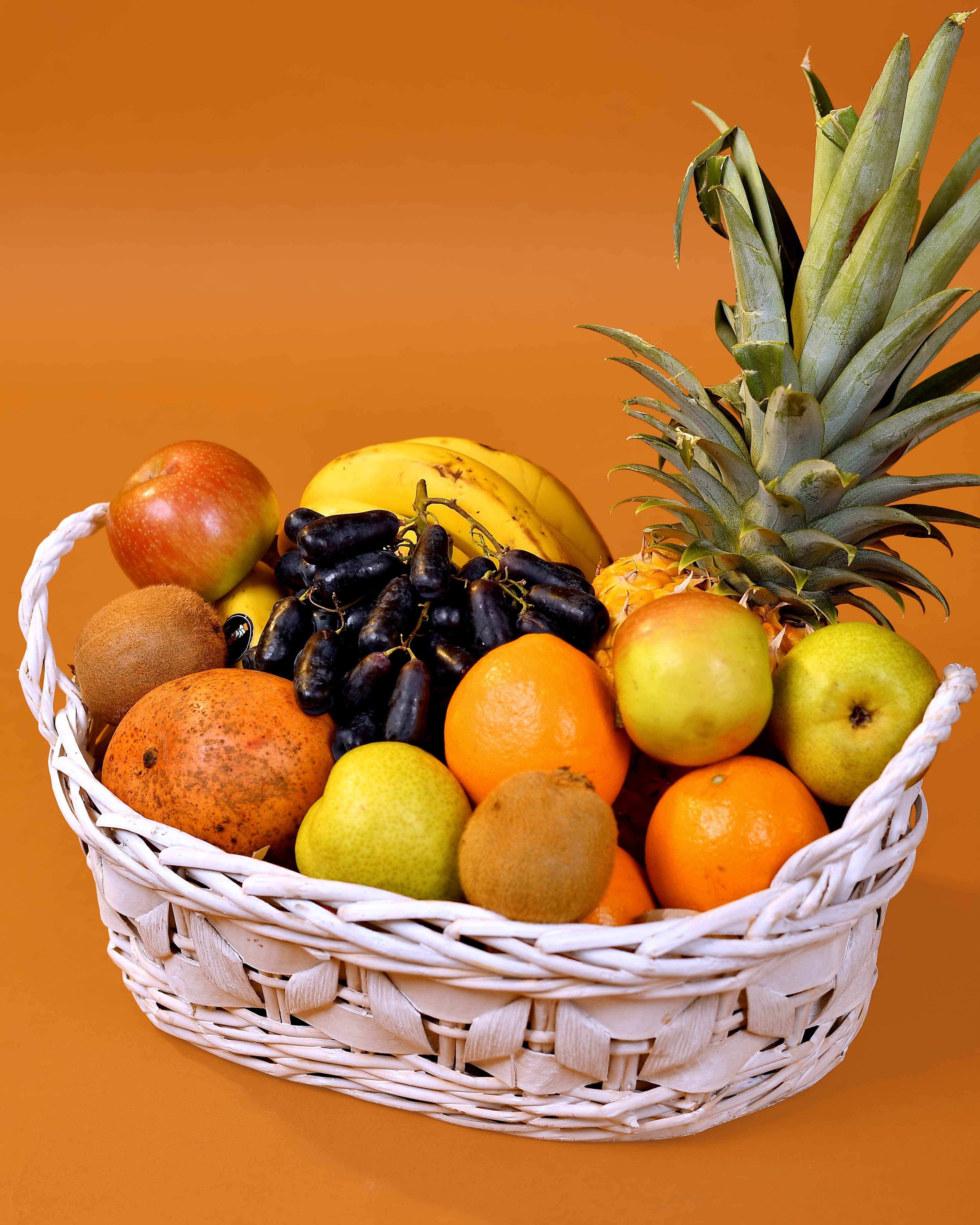 Fruit Selection: Pineapple, bananas, oranges, apples, pears, grapes, kiwi.