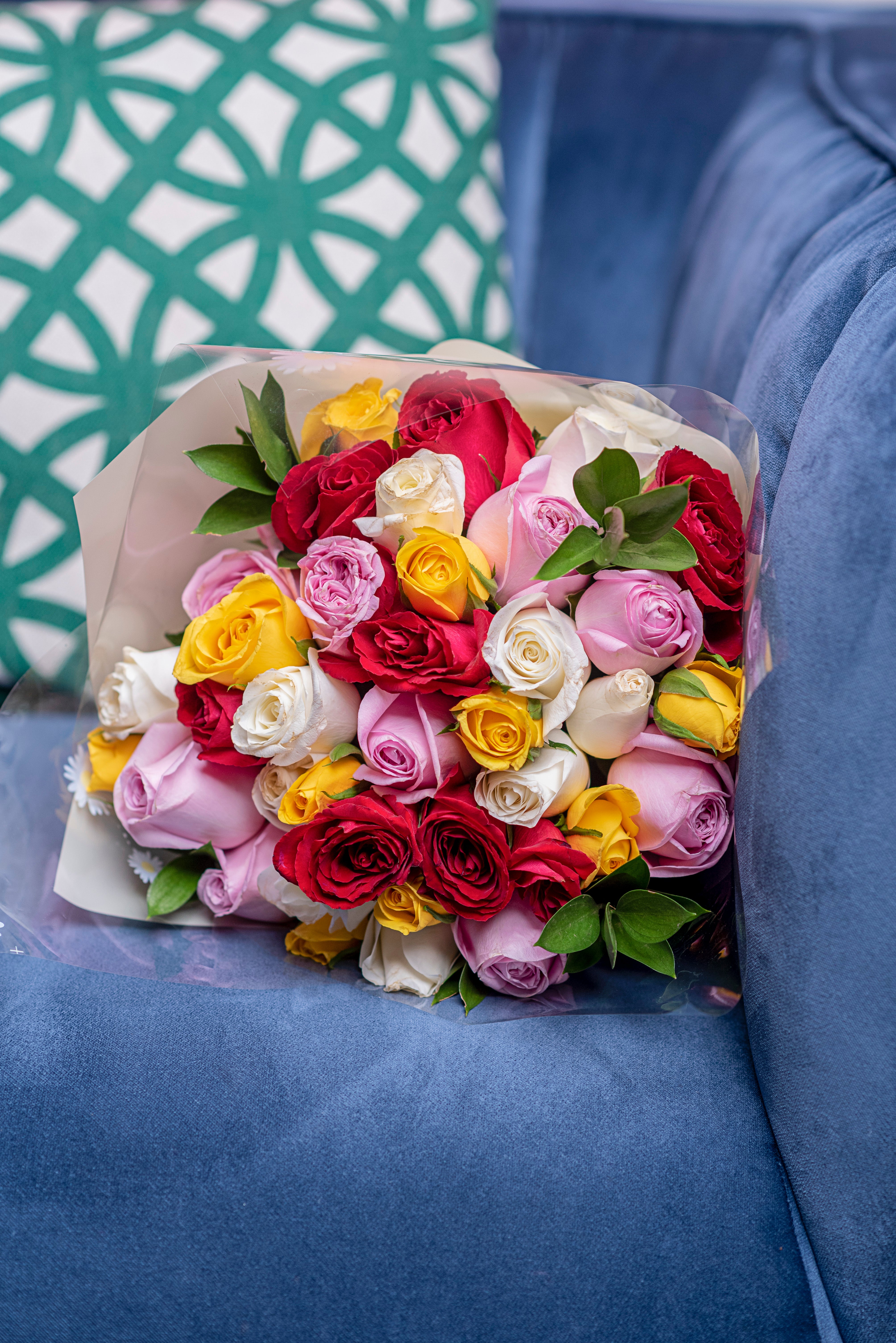DescriptionThe charm of coloured red roses is fully explored in this beautifu and colourful bouquet with a taste of red , yellow, white and pinks with greenery . This bouquet is perfect for any occasion. Specifications Weight: 200gr Usage: Indoor & outdoor