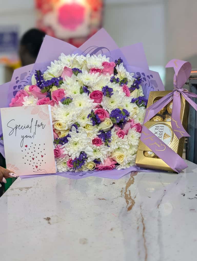 Pink is fabulous and beautiful and its the main star of the show in this purple and pink bouquet. Featuring chrysanthemums and purple fillers with pink roses this beautiful packahe also comes with ferrero Rocher chocolates in 8 pieces .
