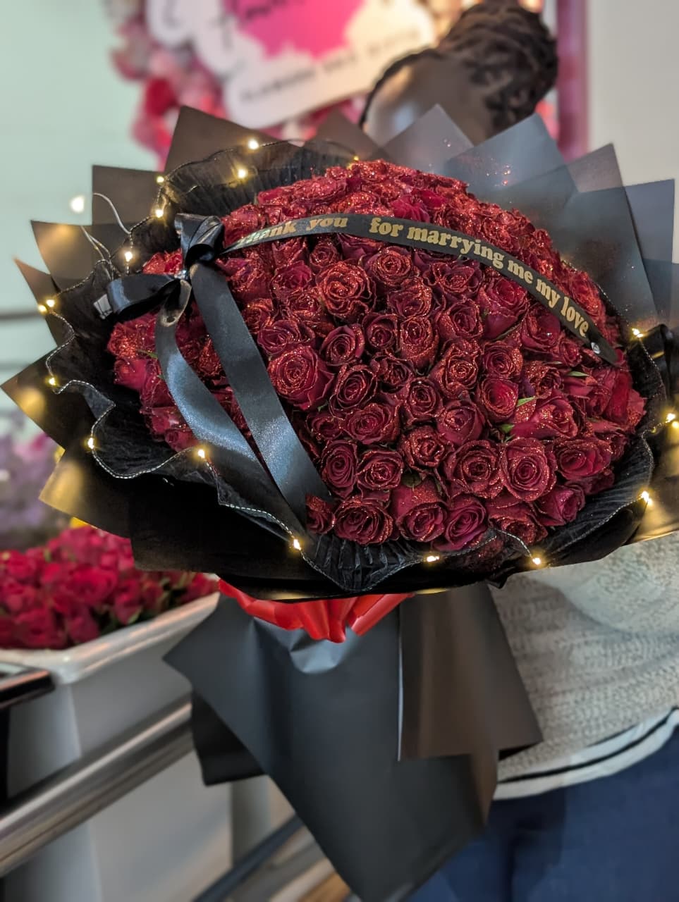Magestic Boouquet large and ready to stun. This bouquet features 150 red roses in glitter and has a lighting feature that will light up the room .