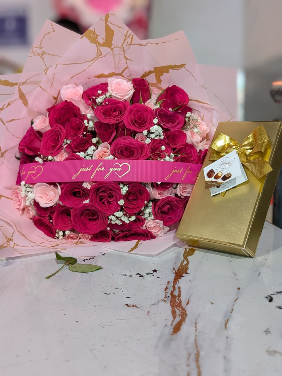 The hottie bouquet is a beautiful number featuring hot pink and blush pink roses with baby breath and paired with guylian belgian hamlet chocolates and a just for you hot pink band.
