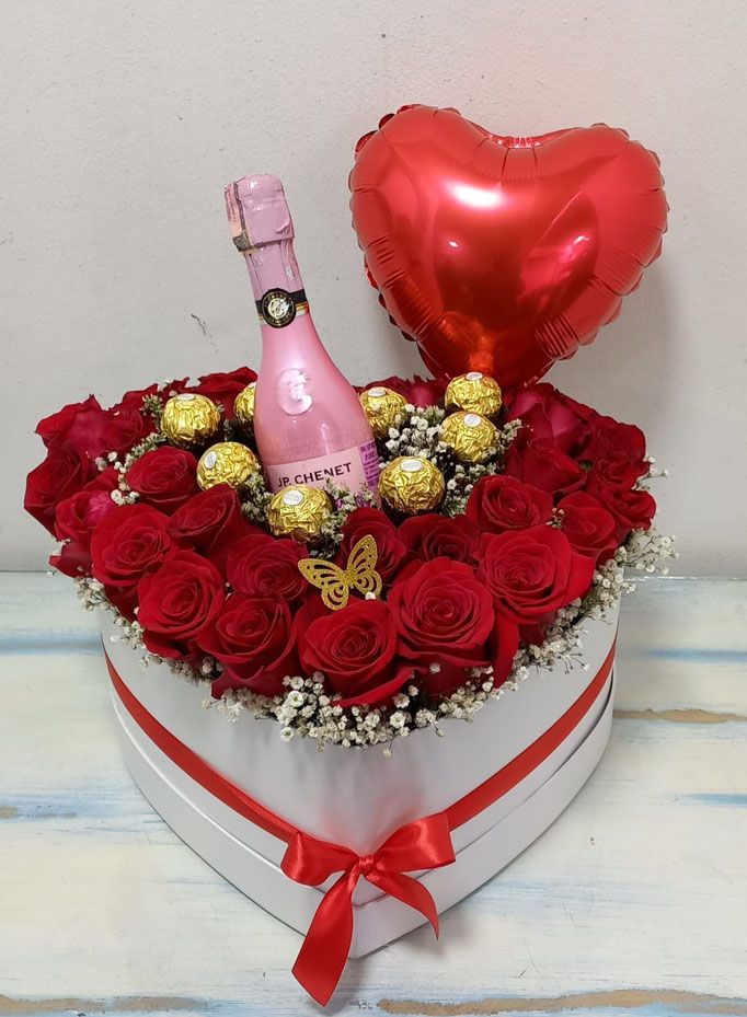 The JP bouquet features delicious ferrero rocher chocolates and red roses with a bottle of JP Chenet . and a...