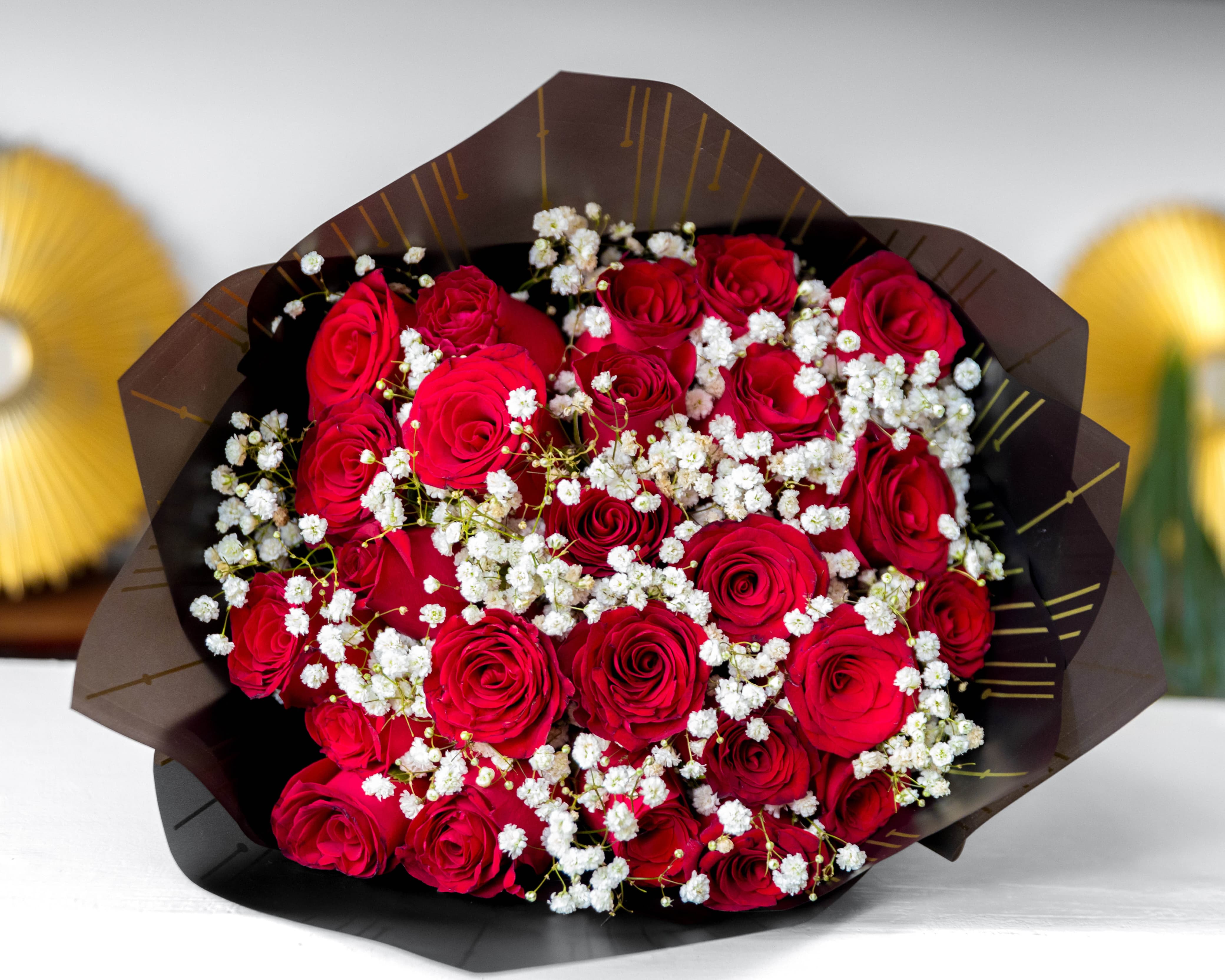 Our best selling Linda bouquet is a beauty with a sight to behold . The bouquet is the classic red roses with baby breath and wrapped with beautiful red wrapping . This also comes in different sizes