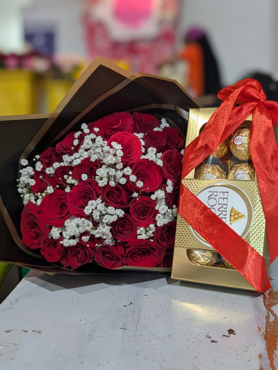 Our best selling Linda bouquet is a marvel . The bouquet features red roses in 30 stems and we have paired it beautifully with ferrero rocher 8 pieces . This best seller is perfect for all occasions.