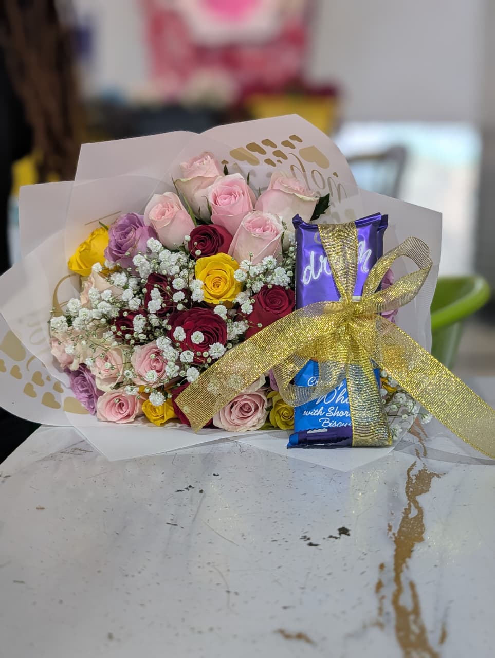 Beautiful mixed roses of the day with pink , red , yellow and white with baby breath . The bouquet has 25 stems of roses and baby breath and its paired with beautiful pair of dairy milk chocolates.