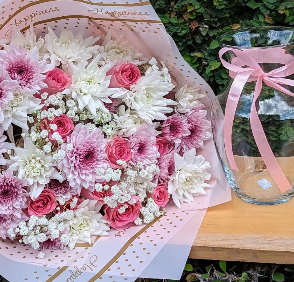 This beautiful bouquet featuring purple and white chrysenthamums with baby pink roses and baby breath to finish off the bouquet . The bouquet also comes with a vase.