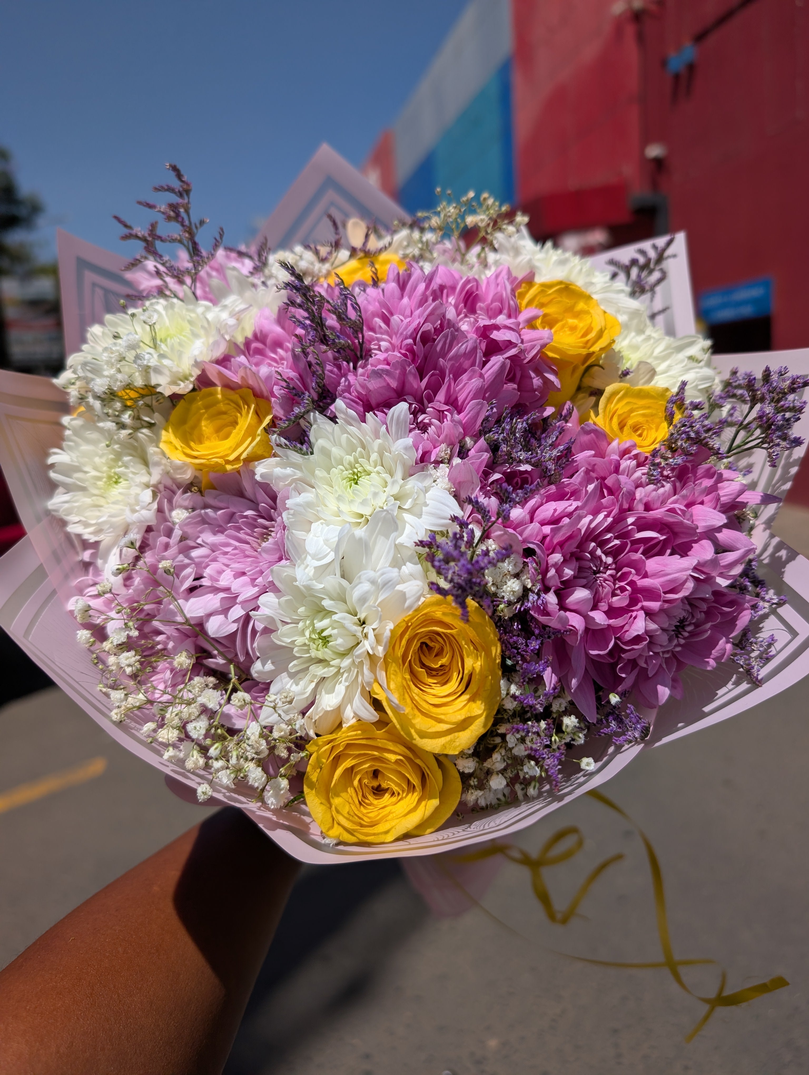 Get a POP of colour with this beautiful bouquet that features subtle white and light purple chrysenthamums and a yellow roses with purple and white fillers .