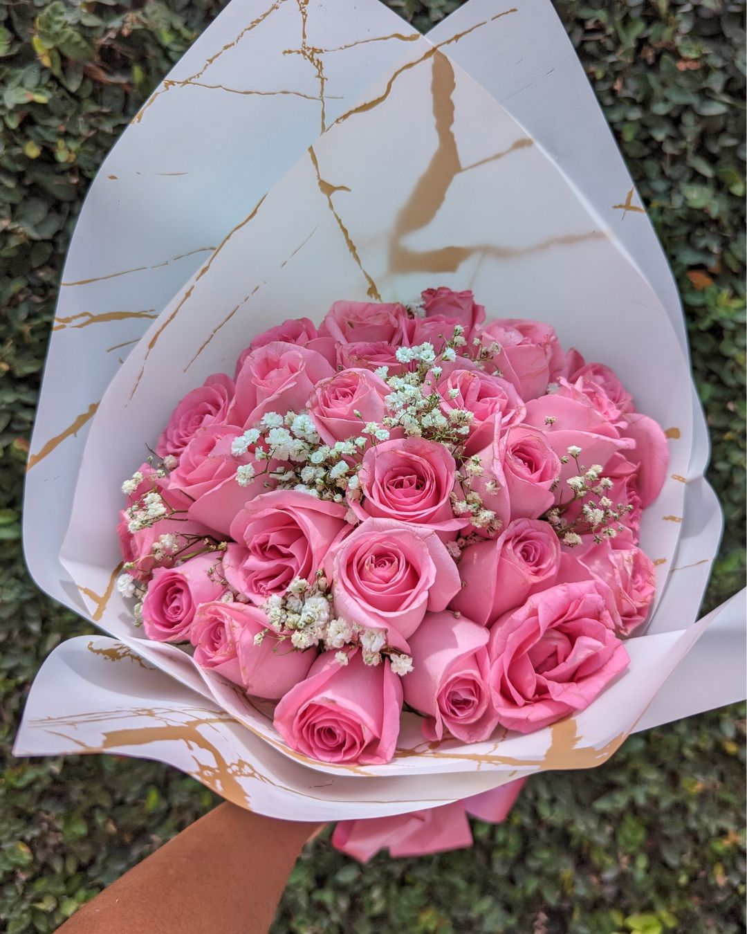 This beautiful bouquet is a marvel and it consists of baby pink roses with baby breath wrapped beautifully on marble theme wrapping.