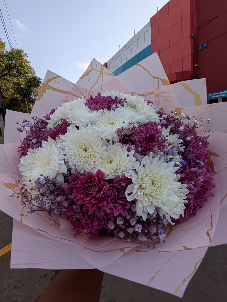 The riz bouquet is just what we like in a bouquet . The bouquet is themed purple and white with different shades of purple . This bouquet is a best seller and its wrapped in luxe pink marble and perfect also for every occasion .