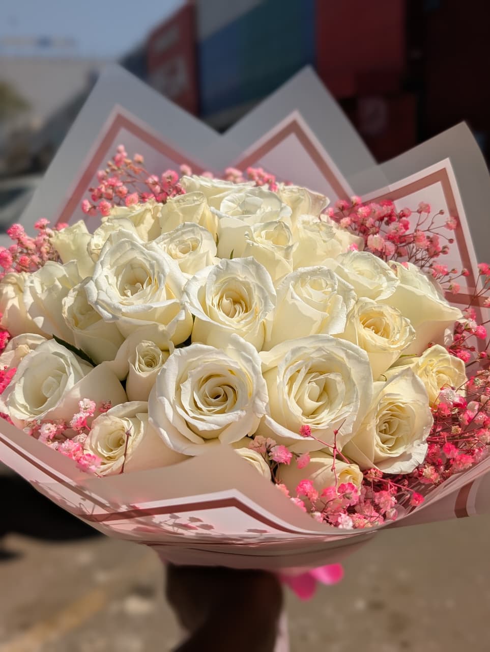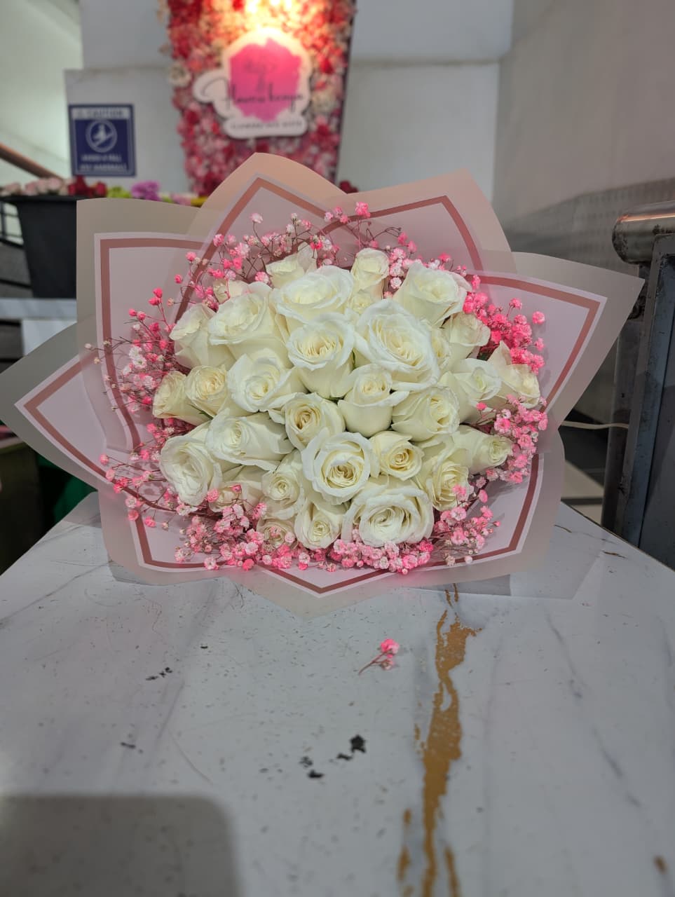 Rosy mist bouquet features majestic white roses with pink gypsophillia and wrapped in pink theme wrapping.