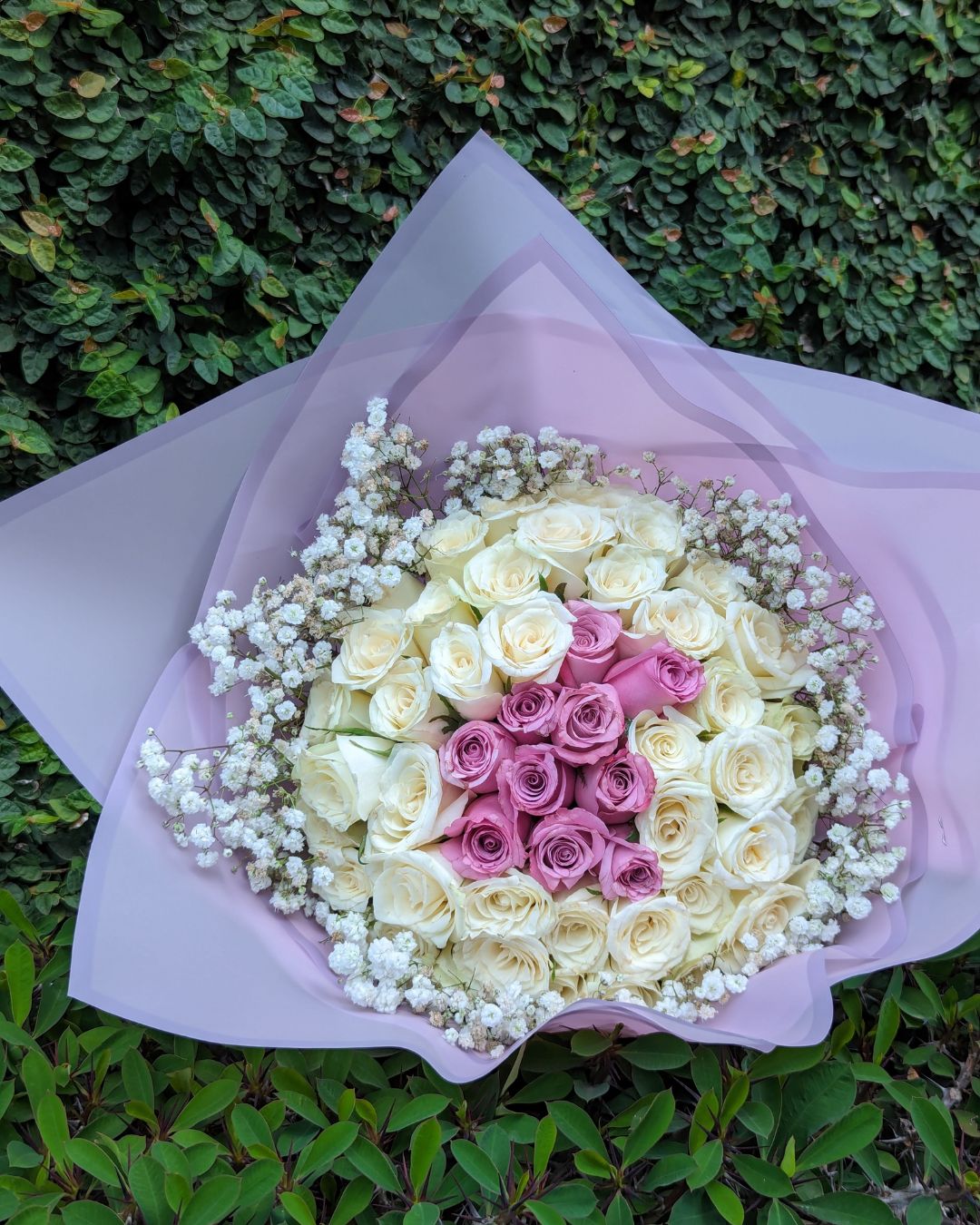 Snow Purple bouquet is a beautiful combination of white and lilac roses in this purple themed bouquet with baby breath . The bouquet is lilac themed and perfect to gift your bestie or girlfriend