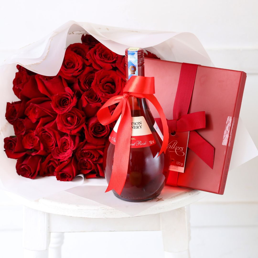 The stunner package is our best selling package with this all inclusive package featuring the red roses wrapped in white , red sweet wine and premium chocolates
