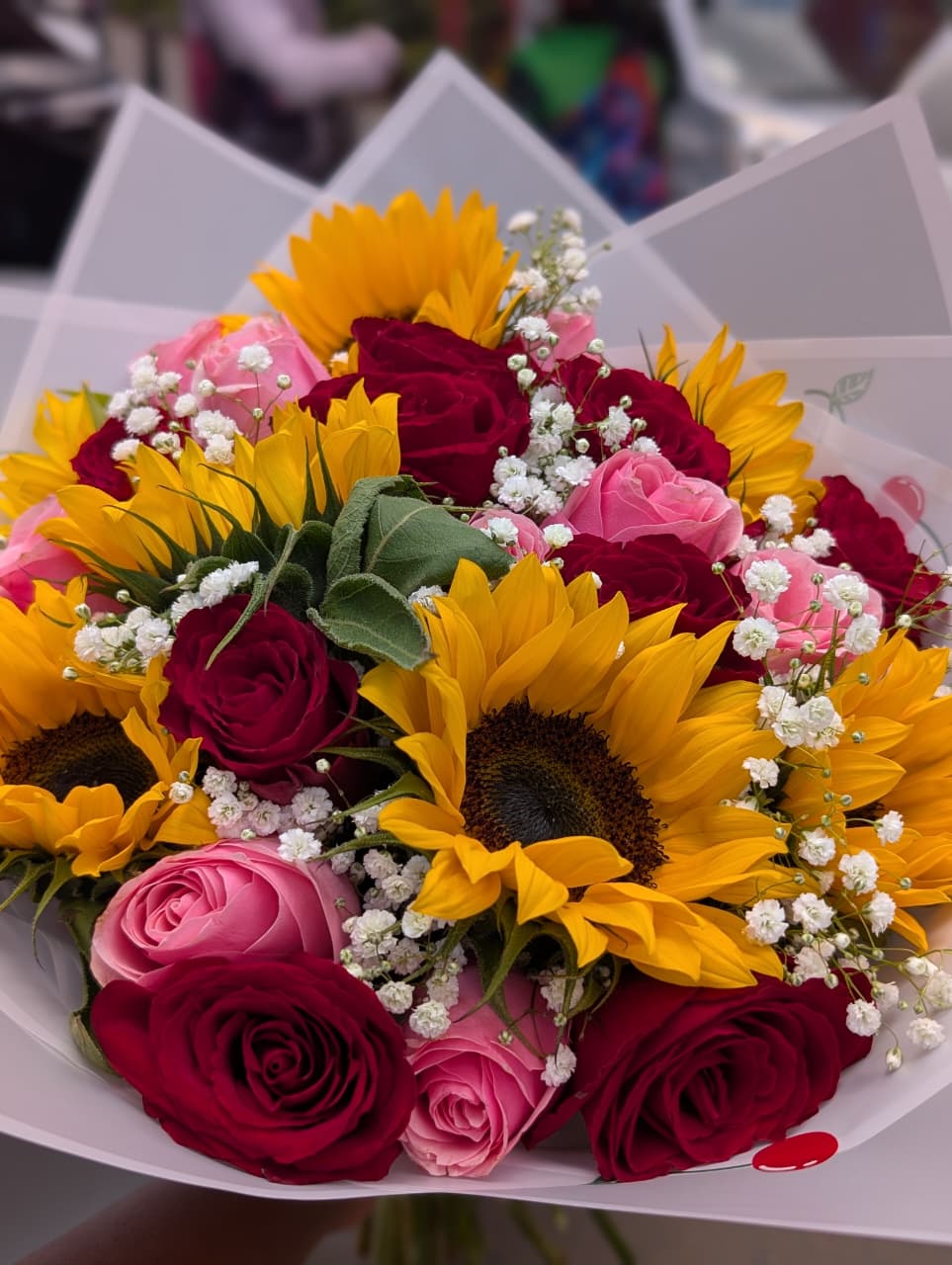sunflowers are beautiful and we paired them with red and pink roses to make this beautiful bouquet .
